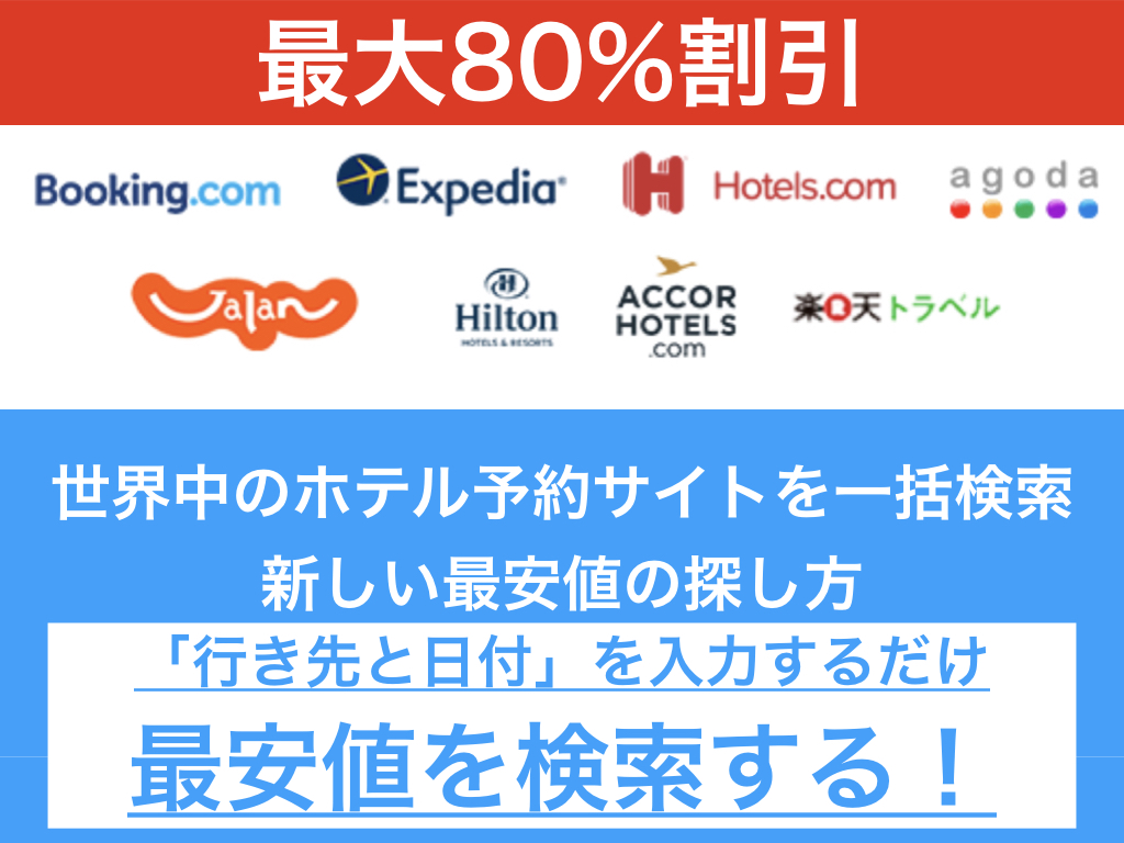行き先と日付を入力するだけで簡単に最安値がわかります。世界中のホテル予約サイトを一括検索して最大80%割引の最安値です。その上、キャンセル無料で後払いもできますので早めに予約しても安心です。世界中の旅行者からのリアルな口コミをご提供し、またたった今予約が入った宿泊もチェック可能です。 世界中200万軒以上の中から理想の1部屋が見つかります。人気ホテルの格安プランも簡単に検索でき、すぐに予約可能です。またSALE料金も大変お得に安全にお支払いできます。ホテル予約は即時に確定でき、当日予約もOK。トラベルキャンペーンサイトの検索機能は宿泊施設を比較して、よりお得な料金を見つけることができます。東京や大阪、名古屋、京都への旅行も目的地を入力するだけで素早く簡単に宿を見つけ出すことが可能です。沖縄や軽井沢周辺には1週間以上の長期旅行にオススメの宿も多数ございます。ネット上の旅行ホテルなどの情報をひとまとめ!各社に寄せられる口コミを総合したホテル評価指数や、1400万枚の写真がホテル選びに役立ちます。