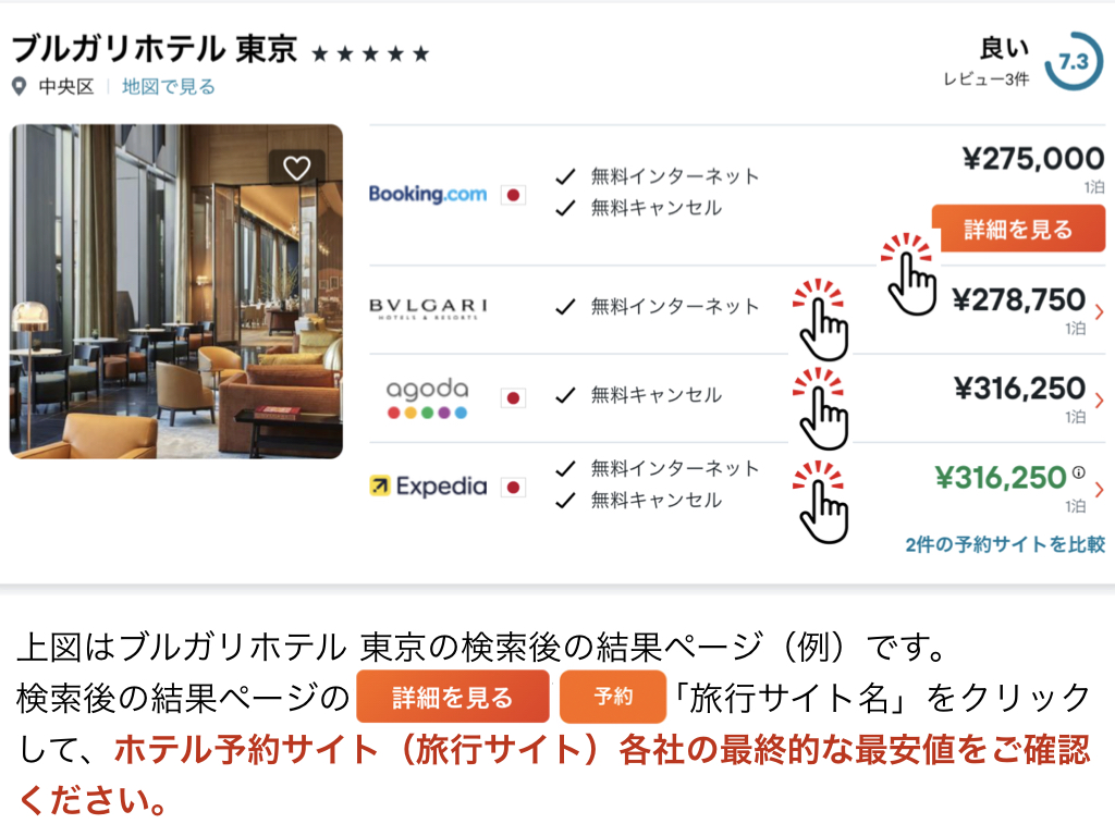 検索後の結果ページの「旅行サイト各社」をクリックして「最終的な最安値」を確認してください。